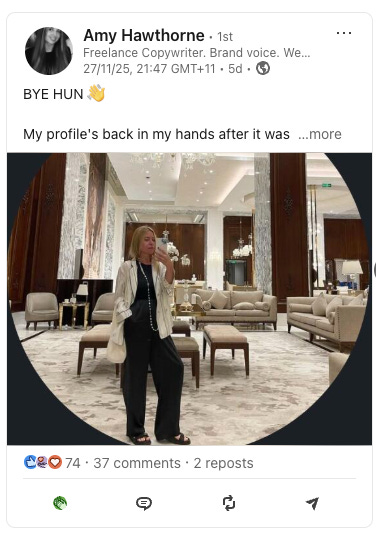 But if you scroll her LinkedIn (which was recently hacked, see screenshot below), you will not see her selling a 3-part repeatable system or codified framework.